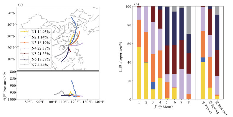 在轨迹聚类分析中,本研究基于气压、经度、纬度数据,使用统计软件(statistical package for the social sciences,SPSS v21),通过Ward最小方差法进行系统聚类,最终得出了7类主要传输路径(见图 1(a)),分别为:长江三角洲(N1,15%)、蒙古高原(N2,1%)、黄海及东部沿海地区(N3,16%)、台湾岛以东海域(N4,22%)、局部地区(N5,21%)、南海(N6,20%)和中南半岛(N7,5%),各类轨迹的季节占比如图 1(b)所示。在本研究中将时间段基于气象条件划分为冬季(1月8日—3月15日)、春季(3月16日—5月15日)和夏季(5月16日—8月20日)[49]。