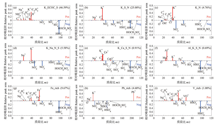 ( 括号中展示的是各类颗粒在含HMS颗粒中的个数占比。The proportion of the particle to total number of HMS-containing particles is shown in parentheses. (a) K_ECOC_S,(b) K_S_N,(c) K_N,(d) K_Na_N_S,(e) K_Ca_S_N,(f) Al_K_S_N,(g) Fe_rich,(h) Pb_rich和(i) V_rich. ) 图 2 利用Art-a分析方法获取的9类含HMS颗粒物的平均质谱图 Fig. 2 Average single particle mass spectra of nine types of HMS-containing particles obtained by using Art-2a analysis method |