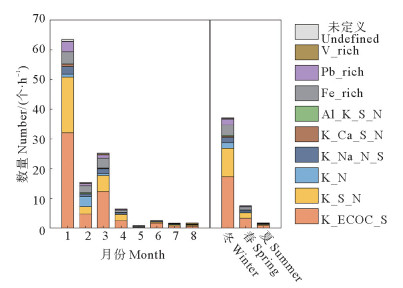 图 3 9类含HMS颗粒物小时个数浓度的平均月份和季节变化 Fig. 3 Monthly and seasonal variations in the hourly number of nine types of HMS containing particles |