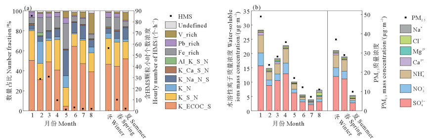 图 4 (a) 9类含HMS颗粒物的数量占比和含HMS颗粒物小时个数浓度的平均月份和季节变化及(b)PM2.5及其水溶性离子(SO42-、NO3-、NH4+、Ca2+、Mg2+、Cl-和Na+)质量浓度的平均月份和季节变化 Fig. 4 (a) Monthly and seasonal variations in the number fraction of nine types of HMS-containing particles, the average hourly number of HMS-containing particles and (b) monthly and seasonal variations in mass concentrations of PM2.5 and its water-soluble ions (SO42-, NO3-, NH4+, Ca2+, Mg2+, Cl-, and Na+) |