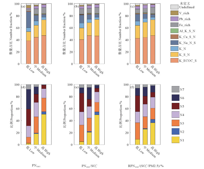 2.3 HMS污染水平的影响因素尽管HMS的平均丰度相较于北京地区较低,我们在研究中依然发现了一些丰度相对较高的事件。由于本研究未对HMS的质量浓度进行膜样品定量分析,我们通过分析含HMS颗粒数(PNHMS)、含HMS颗粒数与硫酸盐质量浓度的比值(PNHMS/SO42-)以及含HMS颗粒相对个数与硫酸盐在PM2.5中的质量分数之比(RPNHMS/(SO42-/PM2.5)) 来评估HMS污染水平,从而探讨不同HMS污染水平下HMS颗粒的化学组成变化及传输来源。基于每种评估参数的25%和75%分位数将HMS的污染水平划分为低、中、高三级。如图 5(a)—5(c)所示,无论采用何种污染评估指标,随着污染程度加剧,生物质燃烧源(K_ECOC_S、K_S_N和K_N)对HMS的贡献呈显著阶梯式增长,突显该排放源在HMS污染形成中的主导作用。与此同时,与海洋源有关的海盐与生物质燃烧混合源(K_Na_N_S)及船舶重油燃烧排放源(V_rich)的贡献占比呈现下降趋势,表明在污染加剧的情况下,海洋气溶胶传输对HMS污染的贡献相对减小。