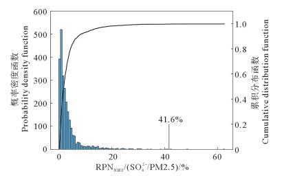 图 6 本研究中RPNHMS/(SO42-/PM2.5)的概率密度函数和累积分布函数 Fig. 6 Probability density function and cumulative distribution function of RPNHMS/(SO42-/PM2.5) in this study |