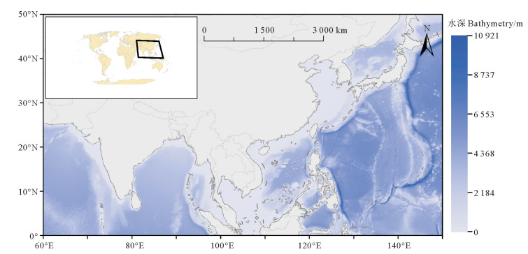( 水深范围为0~10 921 m。Bathymetry range from 0 m to 10 921 m. 审图号:GS(2016)1663号。Map approval number: GS(2016)1663. ) 图 1 研究区域示意图 Fig. 1 Diagram of the study area |