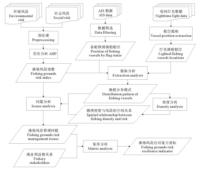 研究运用层次分析法(Analytic hierarchy process, AHP)对11种环境风险和5种社会风险空间加权分析得到渔场风险指数;利用AIS船位数据和夜间灯光数据提取渔船在不同渔场风险海域的分布特征,以分析渔场风险对不同海域渔船捕捞密度的影响,这里渔船捕捞密度指每2°×2°的海域中渔船点位的密度;对渔场风险管理问题和渔业利益相关者进行矩阵分析,提出渔场风险应对能力指标(见图 2)。