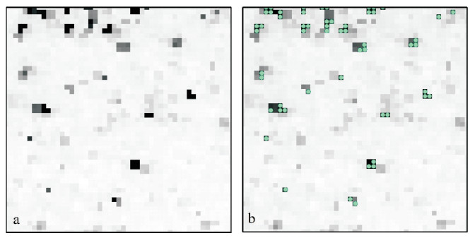 ( a. 夜间灯光原始影像Nighttime light original images. b. 夜间灯光渔船船位提取,绿点为船位点。Nighttime light fishing vessels position extraction, and the green dot is vessels position point. ) 图 3 夜间灯光渔船船位提取示例 Fig. 3 Schematic extraction of vessel position for nighttime light fishing vessels |