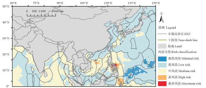 海洋捕捞风险是渔民面临的重要问题之一,恶劣天气、自然灾害及海盗等海上风险常对渔船和渔民安全造成严重的威胁[1-2]。20世纪80年代以来,世界各国通过成立渔业组织或签署相关渔业协定和公约来保障渔业活动的安全[3]。但随着全球气候变化、人口增长等问题的日益突出,海洋捕捞面临着愈加严峻的挑战[4],例如安联保险集团自2012年以来的报告(https://commercial.allianz.com/news-and-insights/reports/shipping-safety.html)表明亚洲沿海及附近海域受热带气旋、地震、海啸的影响海上事故频发[5-6],还有研究表明部分小规模渔业可能涉及违禁品跨境运输[7],这对海洋捕捞业发展构成严重威胁。因此,有必要评价亚洲沿海及附近捕捞海域中的多源风险,以更好制定海洋捕捞业风险管理办法[8]。然而,过去对海洋捕捞风险的研究主要关注:(1)以渔船为研究对象进行渔船碰撞、搁浅、溢油及渔获物转运风险评估[9-12];(2)渔民安全、网具遗弃及非法、不报告和不管制(Illegal, unreported and unregulated, IUU)捕捞风险评估[13-16]; (3)海洋渔业保险及政策研究[17-21]; (4)气候变化背景下的渔业风险评估与管理[22-23]。对海域中威胁渔船和渔民安全的固有风险关注较少,这使得渔民经验仍然是捕捞活动重要的安全保障[24]。虽然卫星通信系统及气象预报系统等安全保障系统在渔业领域已被广泛应用[25-26],但由于亚洲沿海及附近海域超过80%的渔船都是小于12 m的小型渔船[2],其大多并未配备,这导致诸多的渔业安全管理措施实施效果可能并不理想。