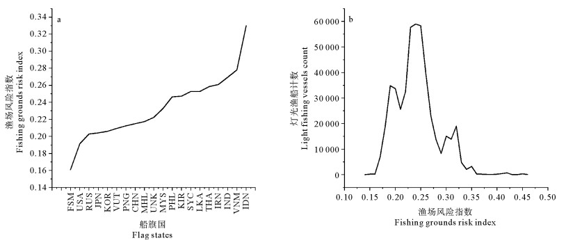 ( a. 各船旗国渔船的平均渔场风险指数分布模式Distribution pattern of average fishing grounds risk index for fishing vessels of various flag states. b. 夜间灯光渔船的渔场风险指数分布模式Distribution pattern of fishing grounds risk index for nighttime light fishing vessels. 各船旗国的标准缩写以联合国国家代码为准,详见表 3。Standardized abbreviations for flag states are based on United Nations country codes, see table 3 for details. ) 图 6 渔船所在海域的渔场风险指数分布模式 Fig. 6 Distribution pattern of fishing grounds risk index in areas fishing vessels located |