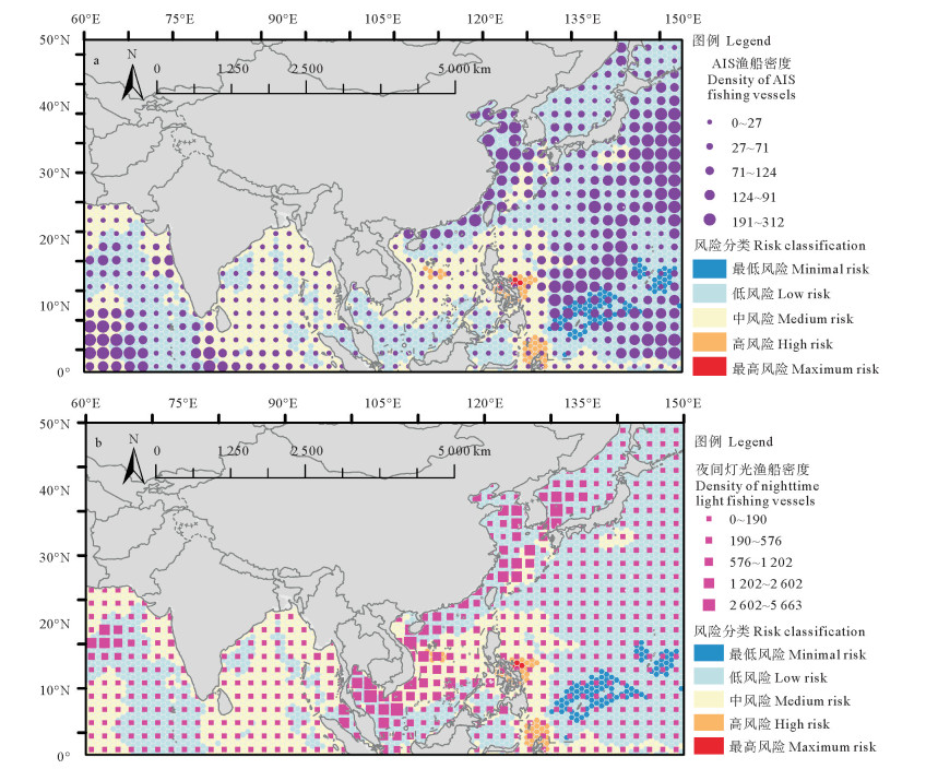 ( a. AIS渔船捕捞热点与渔场风险的空间分布关系Spatial distribution relationship between fishing hotspots and fishing grounds risk by AIS fishing vessels. b. 夜间灯光渔船捕捞热点与渔场风险的空间分布关系Spatial distribution relationship between fishing hotspots and fishing grounds risk by nighttime light fishing vessels. 审图号:GS(2016)1663号。Map approval number: GS(2016)1663. ) 图 7 捕捞热点与渔场风险的空间分布关系 Fig. 7 The spatial distribution relationship between fishing hotspots and fishing grounds risk |