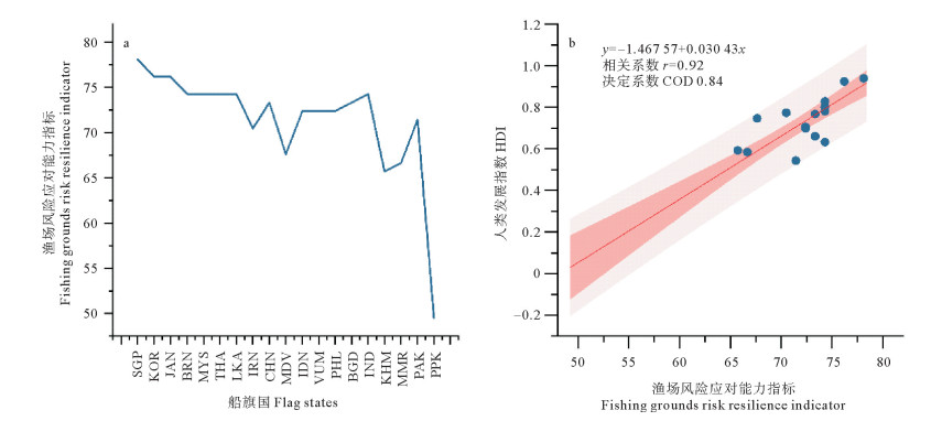 ( a. 各船旗国渔场风险应对能力指标Fishing grounds risk resilience indicator by flag states. b. 渔场风险应对能力与HDI的线性回归Linear regression of fishing grounds risk resilience indicator with HDI.各船旗国的标准缩写以联合国国家代码为准,详见表 3。Standardized abbreviations for flag states are based on United Nations country codes, see table 3 for details. ) 图 8 渔场风险应对能力分析 Fig. 8 Analysis of fishing grounds risk resilience |
