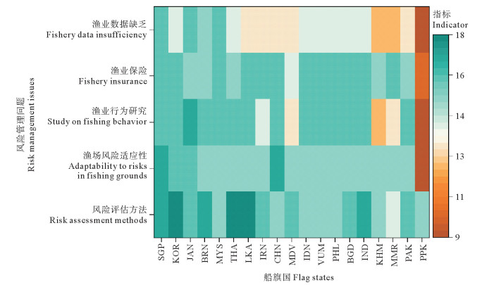 3.4 渔场风险管理建议渔场风险评估为各船旗国制定具体的风险管理办法提供基础的科学依据,对渔船分布模式、捕捞热点与渔场风险空间分布关系的探究为各船旗国提供风险管理思路,渔场风险应对能力指标量化了各船旗国对渔场风险的综合应对能力。为更好地管理亚洲沿海及附近捕捞海域风险,本研究结合渔场风险评价结果给出以下建议: