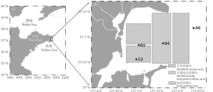 1 材料和方法 1.1 研究区域桑沟湾是位于中国山东半岛东部的一个半封闭海湾(见图 1(a))。海湾总面积为144 km2,平均水深为7.5 m,通过一条宽11.5 km的通道与黄海相连[24-25]。湾内地势平坦,有沽河、桑沟河、崖头河、十里河等几条河流入湾[26]。桑沟湾有从湾口北部向湾内流入、南部向湾外流出的逆时针环流[27-28]。湾内由于陆源输入、养殖物种排泄、水动力较弱和滞留时间较长,导致营养盐浓度较高[12, 14, 25, 29],而湾外水动力较强,使得水体中的营养盐浓度相对较低[30]。同时,桑沟湾的养殖设备,导致湾内海水与外海水的交换显著减弱[31-32]。目前,桑沟湾的浮游植物以硅藻和甲藻为主,其中硅藻占主导[15, 18-19, 33]。桑沟湾主要养殖品种包括扇贝、牡蛎和海带,通过筏架和延绳的方式进行单一养殖或综合养殖[34-35]。发展到现在已经形成贝类-贝藻-藻类的养殖模式。