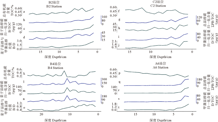 在C2站位,TOC含量为0.35%~0.58%(平均值为0.45%),从16 cm沉积层至表层呈波动型下降趋势(见图 2f)。ΣPB/TOC含量为18.82~126.05 μg/g(平均值为50.55 μg/g),B/TOC和D/TOC含量分别为6.59~85.51和12.24~41.04 μg/g(平均值分别为27.57和22.98 μg/g),B/D为0.53~2.11(平均值为1.06)(见图 2g—j)。所有参数均从16 cm沉积层至表层呈逐渐上升的趋势。