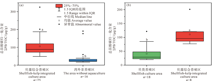 ( 字母a和b表示不同组间存在显著差异(曼-惠特尼U检验,p<0.05)。The letters a and b denote significant differences between groups (Mann-Whitney U test, p < 0.05). ) 图 3 桑沟湾不同养殖区域近40年(a)、近10年(b)ΣPB/TOC箱式图 Fig. 3 The box plots of carbon-normalizedcontents of the sum of brassicasterol and dinosterol (ΣPB/TOC) during the last 40 years (a) and 10 years (b) in different areas of Sanggou Bay |