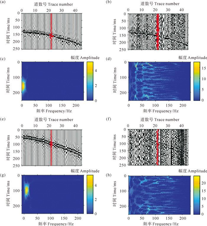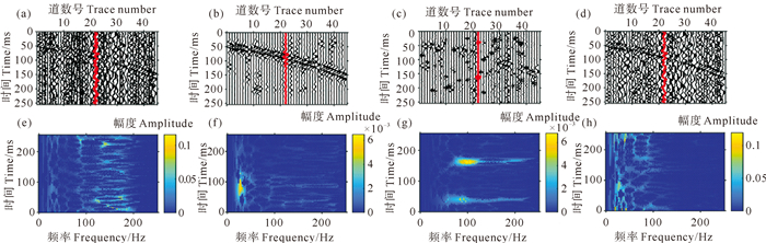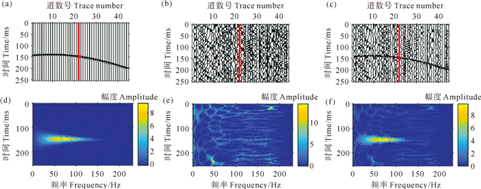 ( (a)合成有效微震信号;(b)加入的实际噪声;(c)加入噪声后的有效微震信号;(d)无噪有效微震信号的时-频谱;(e)噪声的时-频谱;(f)加噪后信号的时-频谱。图中红线指示单道时-频谱所对应的单道微震记录。(a) Synthesized effective microseismic signal; (b) Actual noise added; (c) Effective microseismic signal after adding noise; (d) Time-frequency spectrum of the noise-free effective microseismic signal; (e) Time-frequency spectrum of the noise; (f) Time-frequency spectrum of the signal after adding noise. The red line in the figure indicates the single-channel microseismic record to correspond to the T-F spectrum. ) 图 2 模拟微震记录和时-频谱 Fig. 2 Simulation of microseismic recordings and time-frequency spectra |