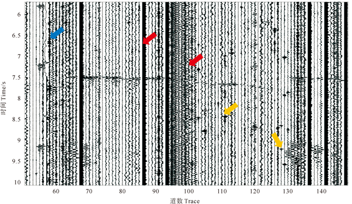 水力压裂过程中所产生的微震信号频率通常在0~200 Hz的区间,为了有效模拟水力压裂过程中的有效微震信号,分别选取频率为20、50、80、110、140、170 Hz的雷克子波进行模拟。由于压裂现场环境干扰严重,地面微震监测所采集到的数据中包含大量干扰信号,这些噪声信号会严重影响到微震信号的提取和微震定位的准确度。图 4所展示的是地面微震监测中常见的噪声,包括:周期性的压裂作业噪声(红色箭头)、偶发性的强噪声(黄色箭头),以及背景随机噪声(蓝色箭头)[32]。其中压裂作业噪声为相干噪声,这类噪声的能量强,频带宽,与有效微震信号在频率域会发生重叠,很难消除。