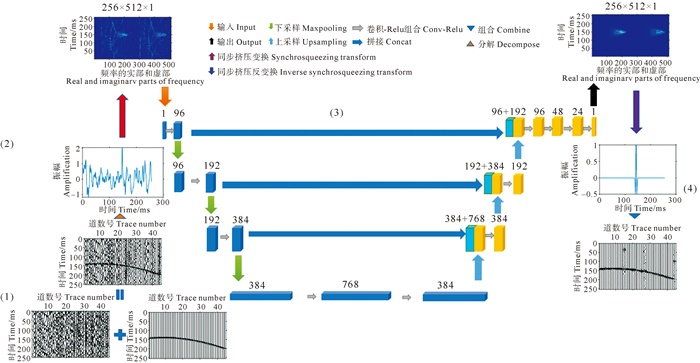 (2) 对模拟含噪微震数据的每一道信号进行同步挤压变换,得到其高分辨率时-频谱。例如,图 6中得到的时-频谱大小为256×512。接下来,将复数时-频谱数据分为实部和虚部进行重新排列。