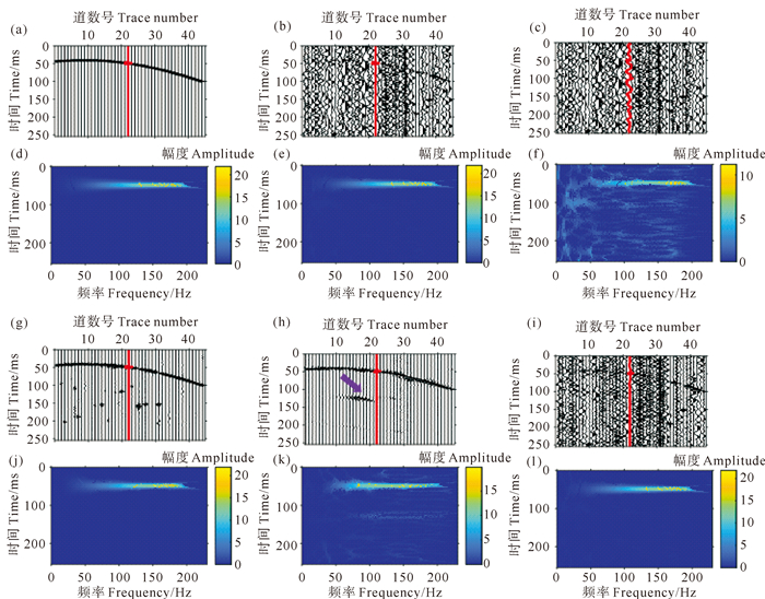 ( (a) 无噪有效信号;(b) 合成含噪微震记录;(c) 添加的噪声;(d) 有效信号的时-频谱;(e) 含噪微震记录的时-频谱;(f) 噪声的时-频谱;(g) 本文方法识别的有效信号;(h) T-S U-NET识别的有效信号;(i) EMD方法识别的有效信号;(j) 本文方法有效信号的时-频谱;(k) T-S U-NET识别的有效信号的时-频谱;(l) EMD方法识别的有效信号的时-频谱。图中红线指示单道时-频谱所对应的单道微震记录。(a) Noise-free effective signal; (b) Synthesized noisy microseismic recordings; (c) Noise added; (d) T-F spectrum of the effective signal; (e) T-F spectrum of the noisy microseismic recordings; (f) T-F spectrum of the noise; (g) Effective signal identified by the method in this paper; (h) T-F spectrum of the Effective signal identified by T-S U-net; (i) Effective signal identified by EMD; (j) T-F spectrum of the effective signal identified by the method in this paper; (k) T-F spectrum of the effective signal identified by T-S U-net; (l) T-F spectrum of the effective signal identified by EMD. The red line in the figure indicates the single-channel microseismic record to correspond to the T-F spectrum. ) 图 8 50 Hz主频的合成数据去噪结果 Fig. 8 Denoising results of synthesized data with primary frequencyof 50 Hz |