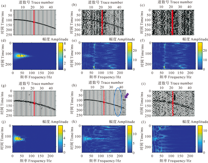 为了进一步测试本文方法对不同频率微震监测资料的消噪能力,再选用主频为50 Hz,信噪比为-9.37 dB的低信噪比合成微震监测资料进行处理,结果如图 8和表 2所示。可以看到,对于信噪比相对较高的微震监测资料,T-S U-net方法处理结果中仍存在部分周期噪声,尤其是35~44道更为明显(见图 8(h)蓝色椭圆圈处)。同时,该方法仍存在识别出虚假有效信号的问题(见图 8(h)紫色箭头处)。在时-频域上,该方法虽然能突出有效信号的分辨率,但与本文方法相比仍残留着大量噪声,且有效信号的能量损失相对较严重。EMD方法消除了资料中大部分的高频噪声,能较为明显地识别出有效信号,但是消噪后数据中仍然存在明显的低频噪声,其消噪后资料的信噪比低于其他两种方法,且在时-频域上未能有效突出有效微震信号,如图 8(i)、(l)所示。相比之下,本文方法仍能有效地识别出有效信号,且对强周期噪声的压制能力和资料的信噪比的改善也优于其他两种方法。