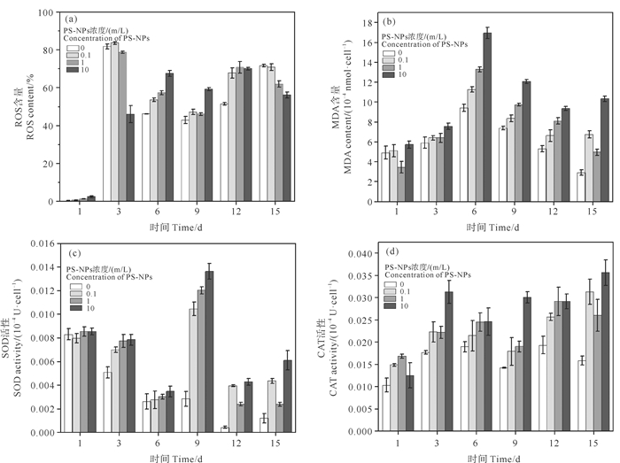 为深入探究东海原甲藻在PS-NPs胁迫下抗氧化防御系统的响应,本研究对东海原甲藻细胞内的ROS含量、MDA的含量、SOD和CAT两种抗氧化酶活性进行了测定。