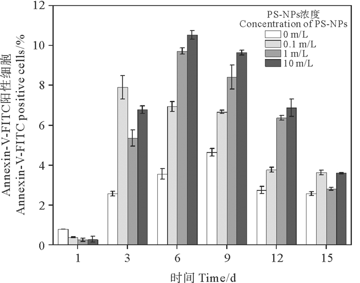 2.4 PS-NPs胁迫对东海原甲藻细胞凋亡的影响东海原甲藻的磷脂酰丝氨基残基外翻细胞(Annexin-V-FITC阳性细胞)的占比随培养时间的延长整体呈先上升后下降的趋势(见图 4)。从第3天东海原甲藻进入对数生长期后,不同浓度的PS-NPs组均显著高于对照组(p<0.05),说明PS-NPs的加入会增加东海原甲藻的Annexin-V-FITC阳性细胞的占比。在第6—12天,对比不同浓度PS-NPs胁迫对Annexin-V-FITC阳性细胞百分比的影响发现,PS-NPs浓度越高,Annexin-V-FITC阳性细胞占比越大,且存在显著性差异(p<0.05)。