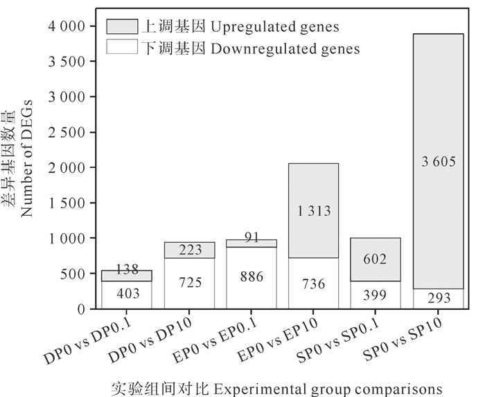 ( 在横坐标各实验组名中:EP、SP和DP分别表示指数期、稳定期和衰亡期;0、0.1和10分别表示PS-NPs浓度(单位:mg/L)。In the names of each experimental group on the horizontal axis EP, SP and DP represent exponential phase, stationary phase and decline phase; 0, 0.1, and 10 represent the different concentrations of PS-NPs (Unit: mg/L). ) 图 5 差异表达基因统计图 Fig. 5 Statistical histogram of differentially expressed genes |