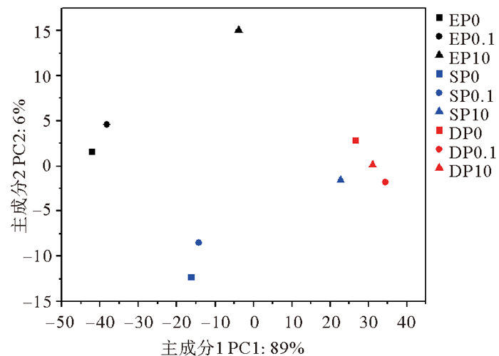 ( 在图例各实验组名中:EP、SP和DP分别表示指数期、稳定期和衰亡期;0、0.1和10分别表示PS-NPs浓度(单位:mg/L)。In the names of each experimental group on the legend: EP, SP and DP represent exponential phase, stationary phase and decline phase; 0, 0.1, and 10 represent the different concentrations of PS-NPs (Unit: mg/L). ) 图 6 差异表达基因主成分分析 Fig. 6 Principal component analysis of differentially expressed genes |