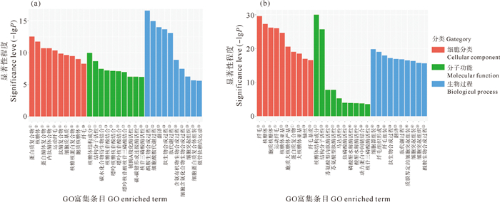 ( ①Protein-containing complex, GO: 0032991; ②Ribosome, GO: 0005840; ③Proteasome complex, GO: 0000502; ④Endopeptidase complex, GO: 1905369; ⑤Motile cilium, GO: 0031514; ⑥Peptidase complex, GO: 1905368; ⑦Cytosol, GO: 0005829; ⑧Ribonucleoprotein complex, GO: 1990904; ⑨Cytosolic ribosome, GO: 0022626; ⑩Cilium, GO: 0005929; B11 Structural constituent of ribosome, GO: 0003735; B12 Structural molecule activity, GO: 0005198; B13 Carbohydrate derivative binding, GO: 0097367; B14 Ribonucleotide binding, GO: 0032553; B15 Purine ribonucleotide binding, GO: 0032555; B16 Purine nucleotide binding, GO: 0017076; B17 Purine ribonucleoside triphosphate binding, GO: 0035639; B18 CoA carboxylase activity, GO: 0016421; B19 Ligase activity, forming carbon-carbon bonds, GO: 0016885; B20 Nucleoside-triphosphatase activity, GO: 0017111; B21 Amide biosynthetic process, GO: 0043604; B22 Cellular amide metabolic process, GO: 0043603; B23 Translation GO: 0006412; B24 Peptide biosynthetic process, GO: 0043043; B25 Peptide metabolic process, GO: 0006518; B26 Organonitrogen compound biosynthetic process, GO: 1901566; B27 Cellular nitrogen compound biosynthetic process, GO: 0044271; B28 Cell projection organization, GO: 0030030; B29 Cellular protein-containing complex assembly, GO: 0034622; B30 Microtubule-based movement, GO: 0007018; B31 Ribosomal subunit, GO: 0044391; B32 Cytosolic large ribosomal subunit, GO: 0022625; B33 Large ribosomal subunit, GO: 0015934; B34 Axoneme, GO: 0005930; B35 Ciliary plasm, GO: 0097014; B36 Threonine-type endopeptidase activity, GO: 0004298; B37 Threonine-type peptidase activity, GO: 0070003; B38 Motor activity, GO: 0003774; B39 Pyrophosphatase activity, GO: 0016462; B40 Hydrolase activity, acting on acid anhydrides, in phosphorus-containing anhydrides, GO: 0016818; B41 Hydrolase activity, acting on acid anhydrides, GO: 0016817; B42 Dynein intermediate chain binding, GO: 0045505; B43 Organelle assembly, GO: 0070925; B44 Cilium organization, GO: 0044782; B45 Cilium assembly, GO: 0060271; B46 Cell projection assembly, GO: 0030031; B47 Cell projection organization, GO: 0030030. ) 图 7 EP0 vs EP10(a)和SP0 vs SP10(b)的差异表达基因的GO富集情况 Fig. 7 GO enrichment of differentially expressed genes of EP0 vs EP10 (a) and SP0 vs SP10 (b) |
