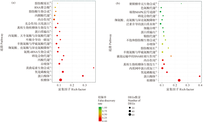 ( ①Ribosome; ②Proteasome; ③Oxidativephosphorylation; ④Aflatoxin biosynthesis; ⑤Phagosome; ⑥Propanoate metabolism; ⑦Selenocompound metabolism; ⑧Aminoacyl-tRNA biosynthesis; ⑨Valine, leucine and isoleucine degradation; ⑩Cysteine and methionine metabolism; B11 One carbon pool by folate; B12 Alanine, aspartate and glutamate metabolism; B13 Protein export; B14 Ribosome biogenesis in eukaryotes; B15 Photosynthesis-antenna proteins; B16 Endocytosis; B17 Pyruvate metabolism; B18 Fatty acid biosynthesis; B19 RNA polymerase; B20 Fatty acid elongation; B21 Protein processing in endoplasmic reticulum; B22 SNARE interactions in vesicular transport; B23 Biosynthesis ofunsaturated fatty acids; B24 Sphingolipid metabolism; B25 Autophagy-other; B26 Ubiquitin mediated proteolysis; B27 MAPK signaling pathway.plant; B28 Tryptophan metabolism; B29 Polyketide sugar unit biosynthesis. ) 图 8 EP0 vs EP10(a)和SP0 vs SP10(b)的差异表达基因的KEGG富集情况 Fig. 8 KEGG enrichment of differentially expressed genes of EP0 vs EP10 (a) and SP0 vs SP10 (b) |