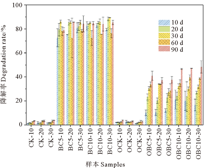 2.2.3 修复过程中沉积物有机质(SOM)的变化添加生物炭可以提高沉积物有机质,且与生物炭添加量成正比(见图 4)。BC组,与第0天相比,修复后BC5、BC10组沉积物有机质分别提高了77.68%、127.18%。OBC组,修复后OBC5、OBC10组沉积物有机质分别提高了64.05%、92.94%。有研究表明,添加生物炭后土壤的有机质含量提高了63.1%[48],相比之下本研究的结果是令人满意的。由于生物炭本身碳含量较高,且浓缩芳香族碳组分的稳定性较强,这可能导致沉积物有机质含量增加[49]。同时,有研究显示生物炭的添加比例显著影响沉积物有机质,且随添加比例的升高而升高,可归因于生物炭自身的芳香度,这通常意味着较好的化学稳定性,有助于碳素在沉积物中的稳定性[50]。秸秆生物炭作为外源有机物料自身含有丰富的有机质,添加至沉积物后可增加沉积物有机质含量,且外源有机质的输入还可以提高微生物及其活性,进而增加有机质含量[51]。此外,生物炭含有微量的K、Ca、Mg、Fe等矿物,添加入沉积物后可以补充部分矿物养分[52],它们可以与有机质相结合,同时生物炭的多孔结构和吸附性能可以延缓养分流失,增加沉积物的养分保持能力[53],也会导致有机质的积累。与之相似的观点,杨玲等[54]的研究发现,生物炭显著提高土壤有机质含量,且随生物炭添加量的增加而增加。另外,生物炭可以改变沉积物的微生物群落结构,并将天然沉积有机质成分转移到更大比例的顽固有机质,这可能会随着长期生物炭改良而改变沉积物有机质周转率[55]。由此可知,生物炭的添加不仅提高了沉积物有机质含量,而且导致矿物元素引入沉积物,从而提高了沉积物的pH值和电导率,这与我们前文的讨论结果一致。有机质在沉积物碳循环中起着重要作用,可为微生物生长和代谢提供碳源和营养物质[56-57],因此,生物炭的施用能在一定程度上改善沉积环境和提高其碳储量。同时,沉积物中的有机质包含腐植酸,可以通过配体交换、静电吸引、疏水性和氢键等过程使沉积物形成带负电的胶体表面,使更高的电流强度和更快的电渗流过沉积物[58]。腐植酸含有大分子疏水性内部基团(脂肪族和芳香族)和亲水性外部基团(羧基、酚羟基、蛋白质和多糖),可以充当表面活性剂促进石油烃在沉积物中的降解[59]。因此,生物炭的施用能提高沉积物中有机质的含量,有利于提高石油烃污染物的去除率。