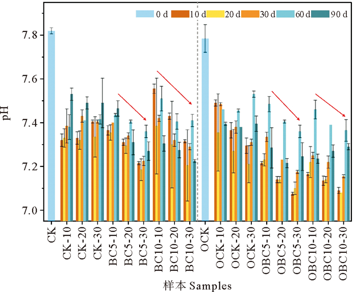 由图 2可知,BC组与OBC组沉积物的pH值在修复过程中与未修复时相比,整体均呈下降趋势,且随着修复时间延长趋向于接近中性值。BC组的pH值在第0天时为7.82±0.01,修复过程中CK组pH值为7.27~7.57(平均7.40),BC5组为7.21~7.49(平均7.33),BC10组为7.09~7.57(平均7.36)。OBC组的pH值在第0天时为7.79±0.05,修复过程中OCK组pH值为7.15~7.54(平均7.39),OBC5组为7.07~7.51(平均7.24),OBC10组为7.08~7.49(平均7.23)。可以看出,低生物炭添加组(5%)与高生物炭添加组(10%)的pH值差别并不明显。而OBC组的pH值低于BC组,这可能是由于石油烃等有机物分解产生一些有机酸类物质的积累,导致pH值降低[43]。也可能是由于微生物可以将石油烃等作为营养物质,使得微生物繁殖代谢加快,而微生物的呼吸作用产生的CO2也会对沉积物pH值的降低起到促进作用[44]。