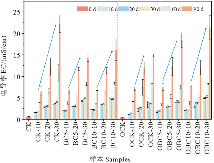 2.2.2 修复过程中沉积物EC的变化BC组的EC在第0天时为0.62~0.67 mS/cm,修复过程中CK组EC为1.52~23.50 mS/cm(平均6.54 mS/cm),BC5组为1.74~14.92 mS/cm(平均5.80 mS/cm),BC10组为2.10~17.95 mS/cm(平均6.11 mS/cm)。OBC组的EC值在第0天时为0.39~0.42 mS/cm,修复过程中OCK组EC值为1.15~15.08 mS/cm(平均5.66 mS/cm),OBC5组为1.62~19.63 mS/cm(平均6.08 mS/cm),OBC10组为2.03~23.40 mS/cm(平均6.73 mS/cm)。由图 3可以看出,随修复时间延长和随人工海水盐度增加,各处理组EC均呈明显升高趋势,且在修复后期(60、90 d)增幅较大。OBC组的各盐度组,随生物炭添加量增加,EC升高。OCK、OBC5、OBC10的EC平均值在盐度10组分别为3.11、3.29、3.63 mS/cm;在盐度20组分别为5.35、5.32、5.65 mS/cm;在盐度30组分别为6.84、7.63、8.82 mS/cm。BC组,盐度10人工海水处理组呈现同样的变化趋势(CK、BC5、BC10的EC平均值分别为3.07、3.25、3.41 mS/cm)。这与前人的研究结果一致,有研究显示,添加生物炭虽然能够改善土壤环境,但会增加土壤的电导率[46],推测主要是由于生物炭的电导率相对较高。因此,在未来的研究中可以考虑在添加之前对生物炭进行预处理,降低其电导率,这可能会进一步提升生物炭的修复效果。而未添加原油组添加生物炭之后,EC较添加原油组相对稳定。推测可能是由于石油烃可以作为微生物的营养物质,且生物炭的多孔结构也可为微生物提供良好的生存环境,使得添加原油组沉积物微生物数量有所增加,有研究显示,土壤中微生物表面带有很多负电荷,电导率也可用来反映土壤微生物的生存状况[47]。