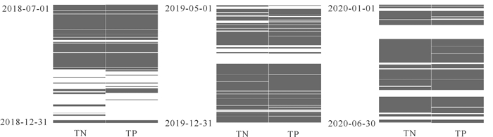 受运行维护或仪器故障等客观因素影响,自动监测水质数据存在不同时间跨度上的缺失,因此需要对该部分氮磷浓度数据进行填充处理。整合2018—2020三年间TN、TP自动监测数据缺失情况如图 2所示。其中,深色部分表示该时间记录点内记有水质数据,白色部分则表示该时间记录点对应的水质数据缺失。由图 2可知,氮磷浓度数据的缺失情况有所差异,可被视作遵循随机缺失机制[20]。