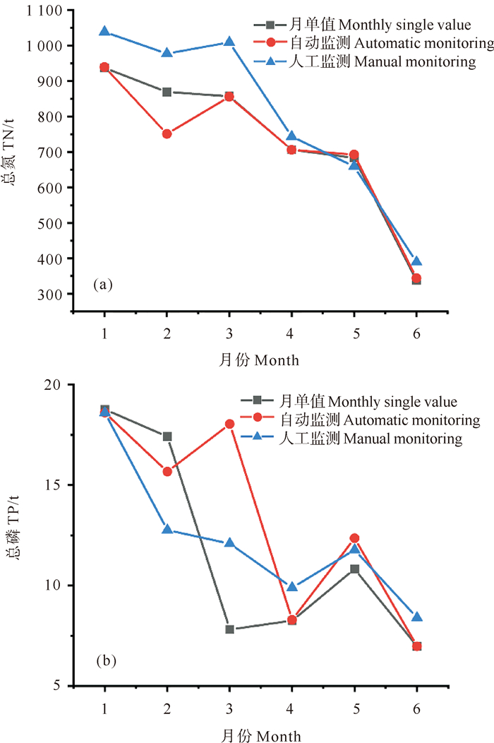 对于自动监测水质数据源,计算求得氮磷浓度的日均值。单日情况下,利用氮磷浓度日均值和日径流量根据公式(2)计算当日氮磷污染物通量,累加日通量结果后可得到基于自动监测水质数据的当月氮磷污染物通量估算值。