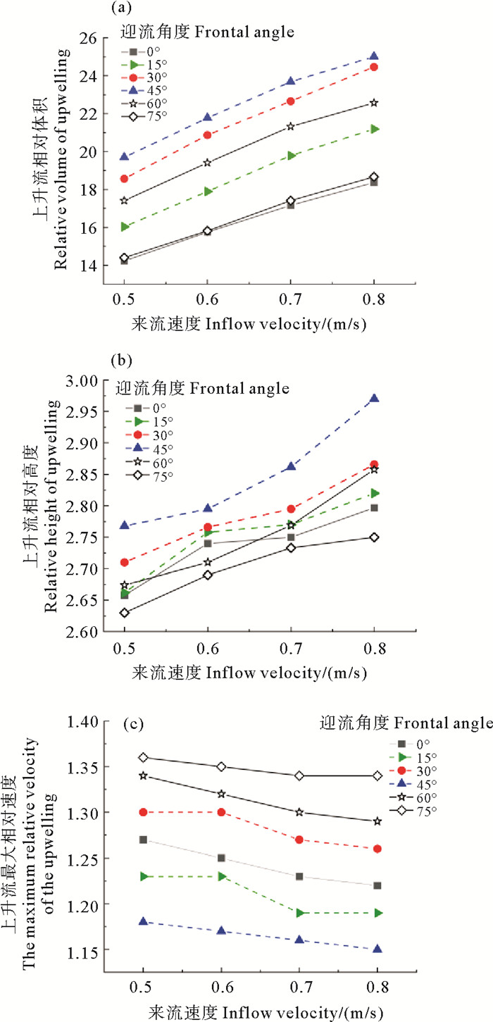 从图 10中可以发现:在不同迎流角度下,礁体产生的上升流相对体积均随来流速度的增大呈线性递增趋势,且递增速率基本一致,当来流速度为0.8 m/s时,上升流相对体积达到最大,此时流场垂向空间可达性较优,生成的上升流相对体积最大可达礁体体积的25.01倍;不同迎流角度下,上升流相对高度与来流速度成正比,来流速度对上升流最大相对速度的影响较小。因此,在选择投放海域时,在保证礁体稳定性的前提下,选择来流速度较大的海域建设人工鱼礁区有利于上升流的生成,从而促进营养物质在不同水层之间扩散,改善海域生态环境。
