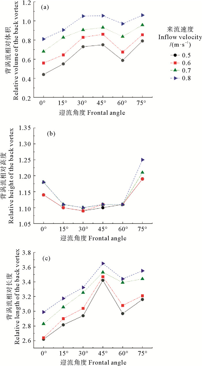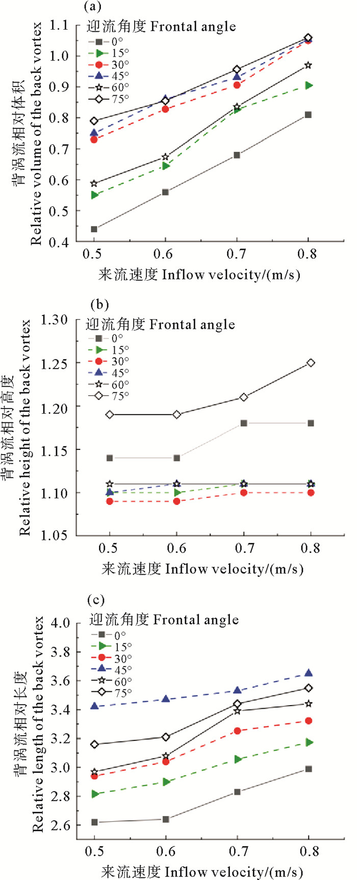 图 11给出了在不同迎流角度下礁体背涡流规模随来流速度的变化规律。从图 11中可以看出,不同迎流角度下,礁体产生的背涡流相对体积和相对长度均随来流速度的增大而逐渐增大。当迎流角度为0°和75°时,背涡流相对高度与来流速度成正比,且在这2种迎流角度下,来流速度对背涡流相对高度的影响要明显大于其他迎流角度。当来流速度为0.8 m/s时,所生成的背涡流体积最大可达礁体体积的1.06倍,同时,背涡流在x向上的最大水平跨度约为礁体边长的3.65倍,这表明来流速度较大时更有利于背涡流的生成。