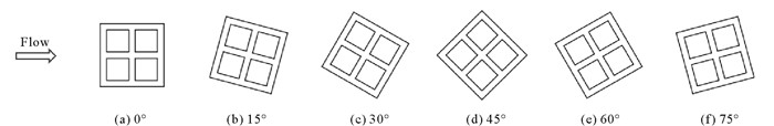 图 12 不同迎流角度下增设倾斜侧板的方形人工鱼礁体俯视图 Fig. 12 Top view of a square artificial reef body with inclined side plates at different heading angles |