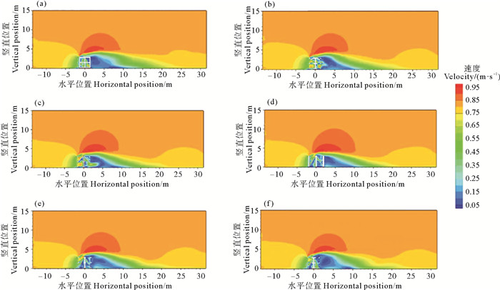 ((a)迎流角度0°; (b)迎流角度15°; (c)迎流角度30°; (d)迎流角度45°; (e)迎流角度60°; (f)迎流角度75°。(a) Frontal angle 0°; (b) Frontal angle 15°; (c) Frontal angle 30°; (d) Frontal angle 45°; (e) Frontal angle 60°; (f) Frontal angle 75°.) 图 13 来流速度为0.8 m/s时,增设倾斜侧板的方形人工鱼礁中y向垂直截面0 m处速度云图 Fig. 13 When the incoming velocity is 0.8 m/s, the velocity contour at 0 m in the vertical section of the y direction of the square artificial reef with inclined side plates |