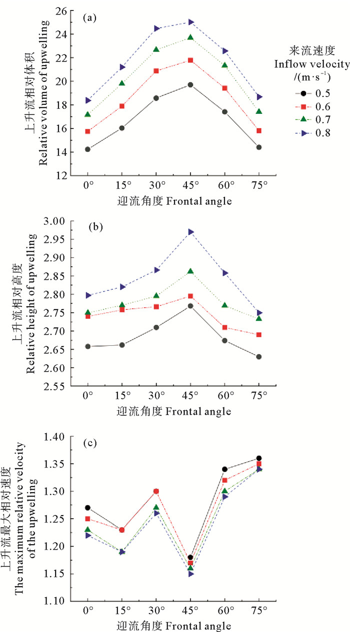 ((a)上升流相对体积Relative volume of upwelling;(b)上升流相对高度Relative height of upwelling;(c)上升流最大相对速度Maximum relative velocity of the upwelling.) 图 15 上升流特性参数随迎流角度的变化 Fig. 15 Variation of upwelling current characteristic parameters with inflow angles |
