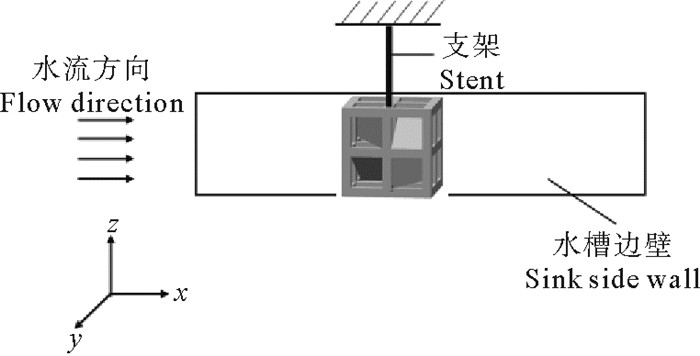 模型的安装如图 2所示,实验在配备水流循环系统的室内水槽中进行,水槽尺寸为4 m × 1.2 m × 1 m,其流速测量范围为0 ~ 1.2 m/s。实验采用声学多普勒流速仪(Acoustic Doppler velocimeter,ADV)精确测量测点位置处的流速。