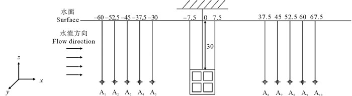 (x向为顺流向;y向垂直槽壁;z向垂直向上。A1—A10分别为各个测点的位置。单位:cm。x is the direction of flow; y is the direction perpendicular to the wall of the groove; z is the direction perpendicular to the upward direction.A1—A10 are the positions of each measurement point.Unit: cm.) 图 3 垂直槽壁截面0.075 m处模型周围速度测点位置示意图 Fig. 3 Schematic diagram of the position of velocity measurement points around the model at 0.075 m of the vertical groove wall cross-section |