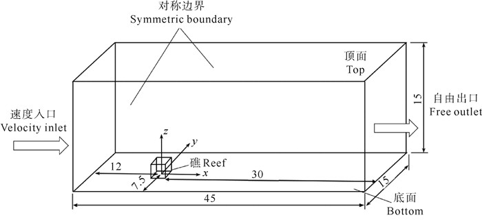 1.2.2 计算域和边界条件方形人工鱼礁体数值模型的礁长L为3 m,框架厚度为0.3 m,侧板厚度为0.12 m。为准确模拟礁体周围流场情况,计算域的长度需达到9倍礁长(礁前为3倍礁长,礁后为5倍礁长),计算域宽度需达到5~6倍礁宽,计算域高度应达到4倍以上礁高[23]。基于此,建立如图 4所示的长方体计算域,其长×宽×高为15L×5L×5L(即45 m×15 m×15 m),其中礁前为4倍礁长(12 m),礁后为10倍礁长(30 m)。
