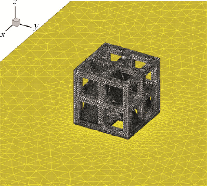 1.2.3 网格划分由于增设倾斜侧板的方形人工鱼礁结构较为复杂,礁体内部4个侧板具有一定的倾斜角度,需要考虑多种因素。因此,本文采用四面体非结构化网格进行计算域的体网格划分,并使用了ANSYS Workbench Meshing组件的自适应网格划分方式。该方式可以自动对礁体周边的网格进行细化,如图 5所示。