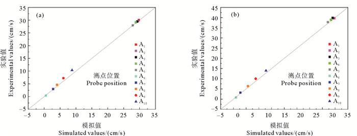 ((a)入口流速0.3 m/s; (b)入口流速0.4 m/s。(a) Inlet flow velocity 0.3 m/s; (a) Inlet flow velocity 0.4 m/s.) 图 6 不同来流速度下测点处流速模拟值与实验值关系 Fig. 6 Between the simulated and experimental values of the measured flow velocity at different incoming flow velocities |