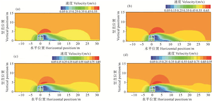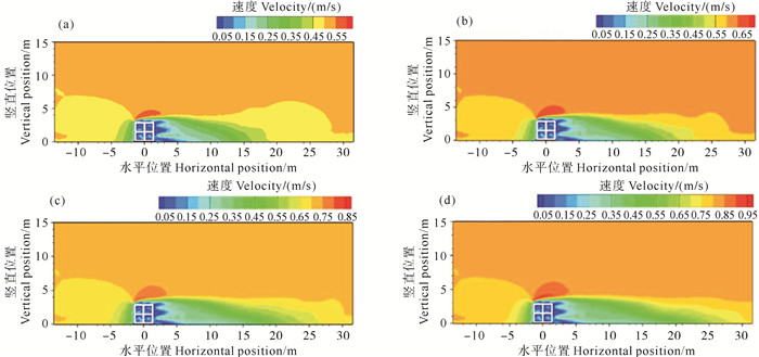 ((a)入口流速0.5 m/s; (b)入口流速0.6 m/s; (c)入口流速0.7 m/s; (d)入口流速0.8 m/s。(a) Inlet flow velocity 0.5 m/s; (b) Inlet flow velocity 0.6 m/s; (c) Inlet flow velocity 0.7 m/s; (d) Inlet flow velocity 0.8 m/s.) 图 7 迎流角度为0°时未增设倾斜侧板的方形人工鱼礁在y向垂直截面0 m处的速度云图 Fig. 7 Velocity contour of a square artificial reef without inclined side plates at 0 m in the y direction perpendicular section at frontal angle of 0° |