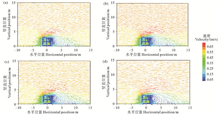 ((a)入口流速为0.5 m/s; (b)入口流速为0.6 m/s; (c)入口流速为0.7 m/s; (d)入口流速为0.8 m/s。(a) Inlet flow velocity 0.5 m/s; (b) Inlet flow velocity 0.6 m/s; (c) Inlet flow velocity 0.7 m/s; (d) Inlet flow velocity 0.8 m/s.) 图 9 迎流角度为0°时增设倾斜侧板的方形人工鱼礁中y向垂直截面0 m处速度矢量图 Fig. 9 Vector diagram of velocity at 0 m in the vertical cross-section of a square artificial reef with inclined side plates at frontal angle of 0° |