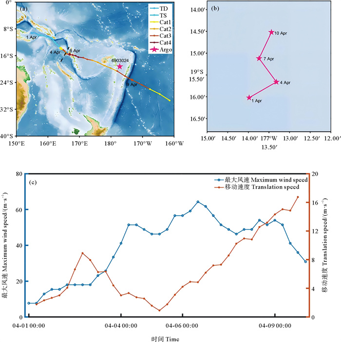 1.3 Argo剖面观测数据Argo是一种用于测量上层海洋生态环境因子的自动剖面浮标,由国际Argo成员国实施布放剖面浮标观测资料。本研究使用全球海洋Argo散点资料集中的核心剖面浮标(Argo)、生物地球化学剖面浮标(BGC-Argo)两个数据产品来源于中国Argo实时资料中心(http://www.argo.org.cn)。本文使用的BGC-Argo浮标编号为6903024,其设定为每3天进行一次下潜采样,对上层海洋的温度、盐度及叶绿素浓度数据进行观测分析,采样的最大垂向深度为1 500 m,在本文重点关注的200 m以内深度,垂向采样间隔约为1 m,可以精细分辨上层海洋的温、盐及叶绿素浓度变化。浮标在Harold经过期间的轨迹如图 1所示,该浮标距离最近的热带气旋路径点约150 km,位于热带气旋路径左侧,可有效捕捉次表层海洋的温度、盐度及叶绿素浓度变化的信号。图 1(b)展示了浮标在Harold经过前后各5 d(4月1—10日)期间的漂移轨迹,可以看到浮标在此期间仅漂移约2.7 km,远远小于热带气旋上千公里的水平尺度和该纬度上百公里的海洋中尺度,因此具有显著的局地代表性。