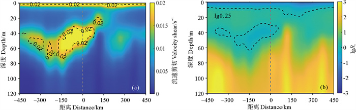 (3) 物理机制分析:通过HYCOM再分析模式数据的计算,发现热带气旋过境期间,上层海洋(20~80 m深度)产生了强烈的流速剪切,导致理查德森数 < 0.25,更易发生剪切不稳定潜在促进混合。同时,路径左侧的剪切不稳定更为显著,进一步解释了路径左侧海洋响应更为强烈的原因。