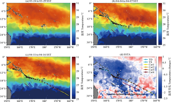 2 海洋表层对热带气旋Harold的响应 2.1 热带气旋Harold介绍南大洋超强等级热带气旋Harold是2020年南太平洋热带气旋季第8个获得命名的热带气旋,生命史为10 d,移动路径、最大风速及移动速度随时间的变化如图 1所示。与全球大多数热带气旋自东向西的移动方向不同,Harold展现出自西向东的移动方向。Harold于2020年4月1日在澳大利亚东北部洋面生成,随后其强度逐渐增强并且向东南方向移动,于4月6日0点强度增强为4级热带气旋,持续时间为1 d,其中心气压于4月6日12点达到最小值920 hPa,并一直保持东南方向移动,最终于4月10日以1级热带气旋强度在160°W附近洋面消散(见图 1(a))。根据热带气旋强度分级,Harold的最大风速在4级,于4月6日12时达到最大值64 m/s;热带气旋的移动速度于4月5日6时为最慢,约为0.9 m/s(见图 1(c))。Harold也是此海区继2015年超强等级热带气旋Pam之后又一个强度达到4级的热带气旋。其过境期间引发的强风、强降水造成巨大的灾害,导致澳大利亚地区累计损失高达1.2亿美元。