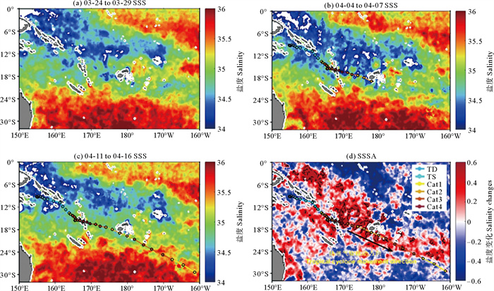 ( 黑色虚线部分表示增盐为0.5的等值线。Black dashed lines represent the 0.5 salinity increase isoline. ) 图 3 Harold过境前后海表盐度((a)—(c))及盐度(d)的变化 Fig. 3 Change of sea surface salinity (SSS) ((a)—(c)) and salinity (d) before and after the passage of tropical cyclone Harold |