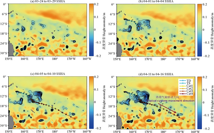 Harold还产生了海表高度异常变化,且以沿着热带气旋移动路径的海表面高度降低为主要特征。图 4为海表高度异常对Harold过境前后的对比,-0.2~-0.1 m范围内等值线作为参考。在Harold过境前,海表高度异常未见大范围的异常过程,以海洋中尺度结构为主(见图 4(a))。4月1—4日,Harold强度等级由热带低压增强至1级强度,过境期间热带气旋路径的左侧海表高度异常呈现降低趋势,最大降低幅度约为0.1 m(见图 4(b))。4月5—10日,Harold增强至4级强度,过境期间海表高度异常在路径左侧降低的趋势非常显著,最大降低幅度约为0.18 m(见图 4(c)),相较于图 4(b),最大降低幅度增加了0.08 m。Harold过境后,海表高度异常在路径左侧的最大降低幅度达0.2 m(见图 4(d))。由于热带气旋的强风引发Ekman抽吸,导致上升流和表层海水辐散,进而降低海表高度。造成海表高度异常最大降低出现的位置与海表最大降温出现的位置相一致,均位于路径左侧。